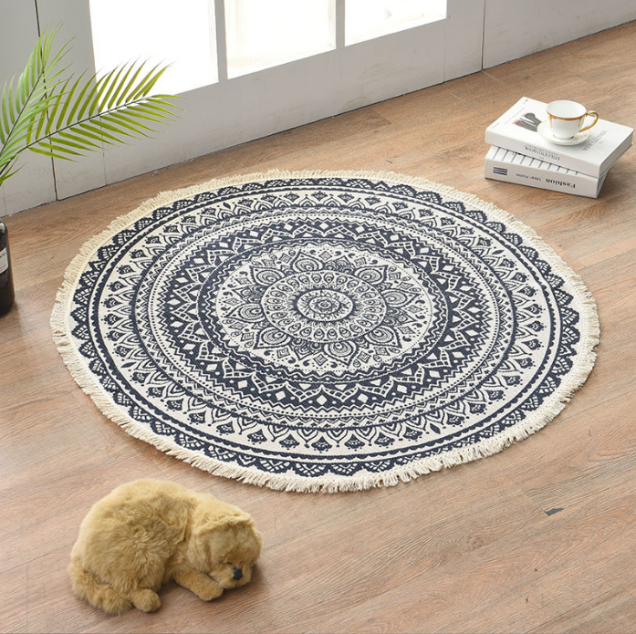 Black Round Cotton Woven Rug Mandala Boho Floor Mat Living Room Bedroom Tasseled Foot Mat Yoga Cushion